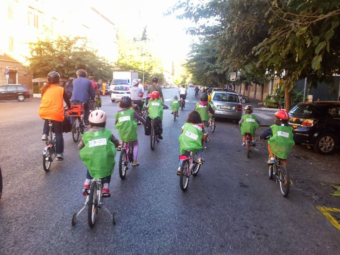 A quasi tutti i bambini prima o poi viene regalata una bici: il mezzo di trasporto più semplice e libero. Ma dove possono usarla? Quando? Spesso viene caricata sopra ad automobili che in weekend si affollano nei parcheggi in prossimità di parchi dove, finalmente, si può pedalare. A tempo determinato. Se non fa troppo caldo o troppo freddo. Tuttavia, in molte città genitori e bambini e hanno cominciato ad autorganizzarsi: un gruppo di genitori dell’Esquilino, a Roma, ad esempio, che da anni si impegna per cercare di rendere la propria scuola e il proprio quartiere luoghi diversi e più accoglienti, hanno iniziato a far andare i propri figli a scuola in bici