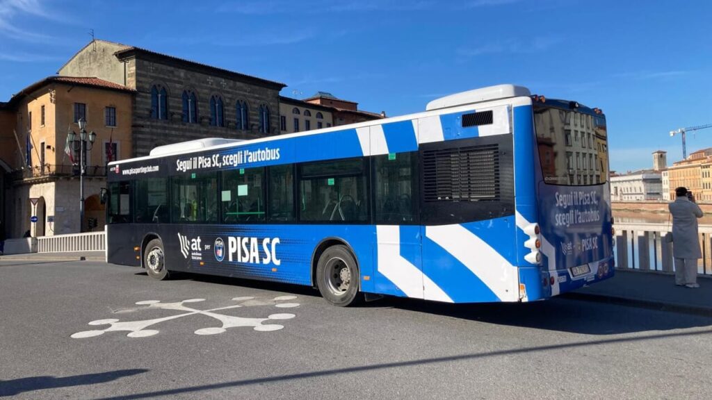 In pratica un bus at interamente brandizzato coi colori e i simboli del Pisa Sporting Club (si veda foto) svolgerà il servizio pubblico di trasporto in città per i prossimi due mesi. Un modo, anche simbolico e visivo, per avvicinare il servizio bus ai pisani che con la propria squadra di calcio hanno un legame molto forte.